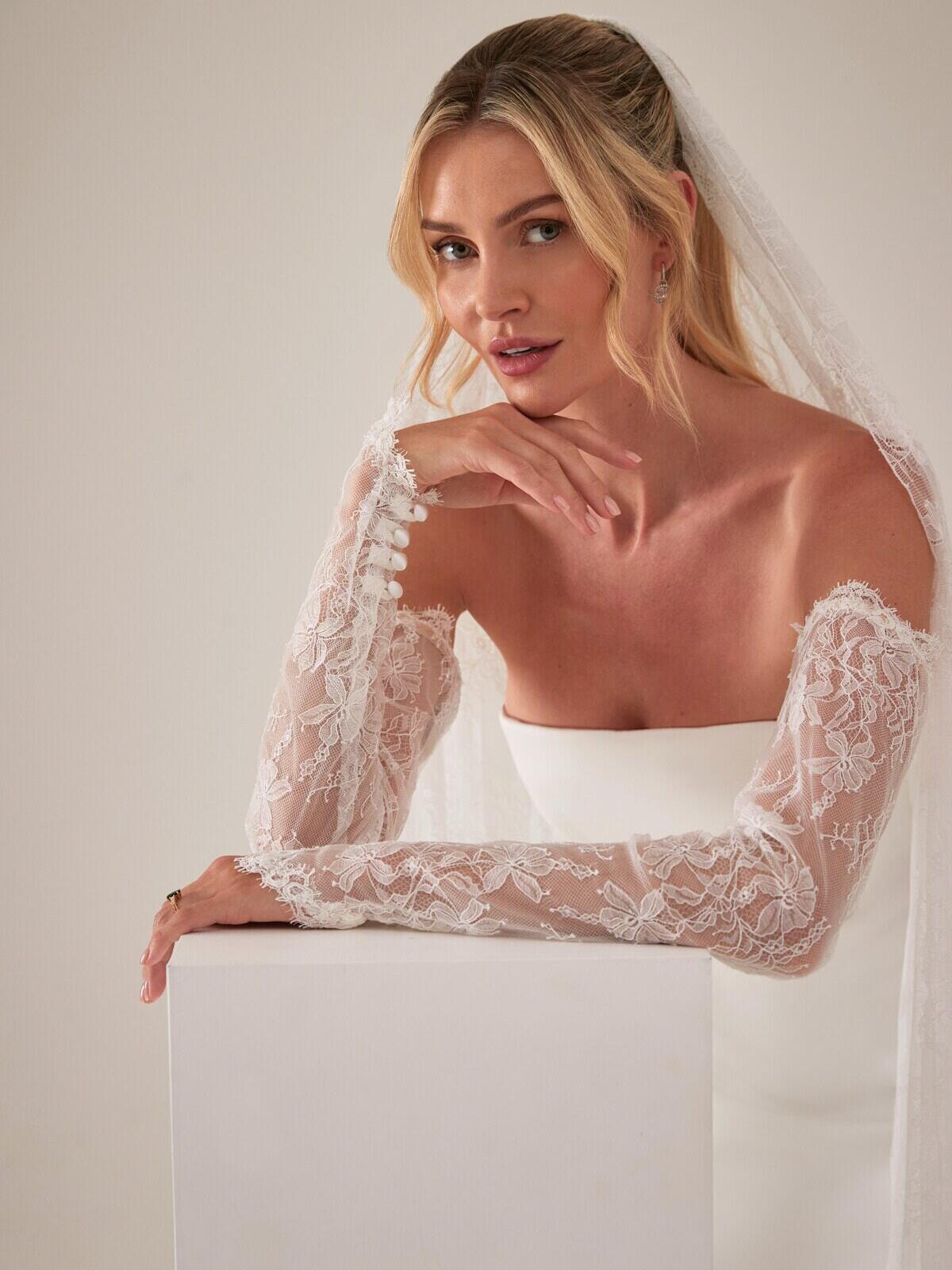 The Connie Sleeves bring delicate romance to the Connie-Mae gown. Crafted in fine lace, they feature a slim fitted silhouette with elegant button detailing at the wrists and a pointed cuff finished with lace appliqué. Designed to transform the look, they offer refined detail and timeless charm.