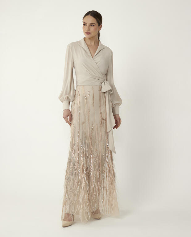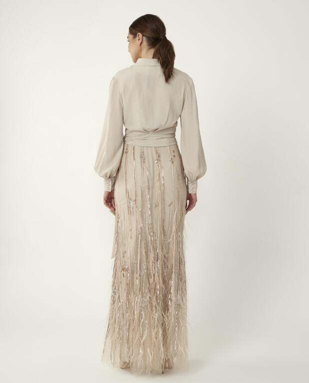 The Ferndale Skirt is designed to captivate. Crafted in a embroidered tulle, with ostrich feather detailing which adds texture and drama, elevating the design with a sense of modern glamour. Paired with the Lynmouth Blouse.