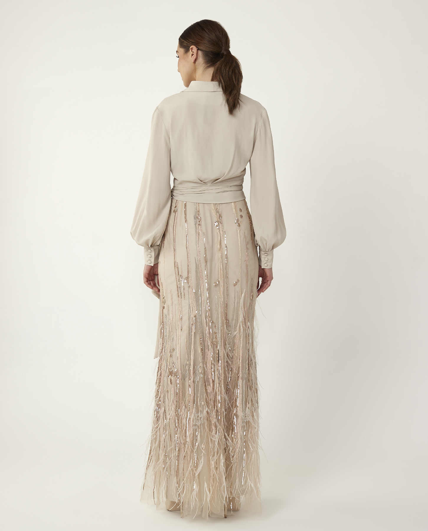 The Lynmouth Blouse is a flattering wrap blouse with a tie detail at the front adding a touch of elegance and versatility. Perfect for pairing with tailored trousers, skirts, or layered under jackets, this blouse is a timeless addition to any refined wardrobe. Styled with the Ferndale Skirt.