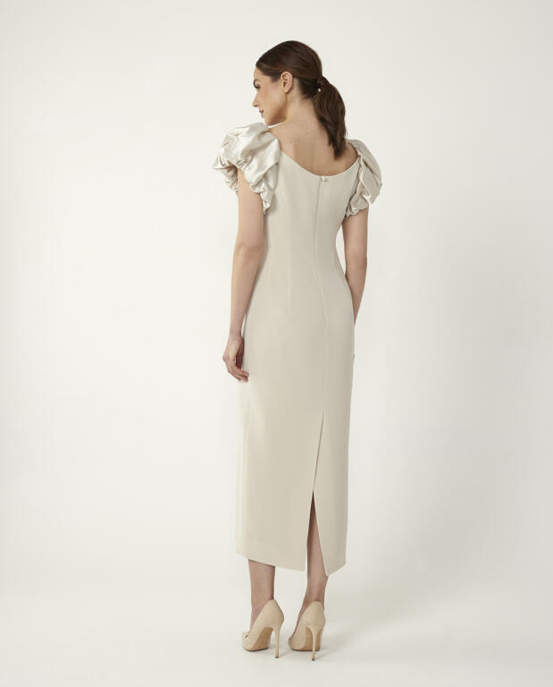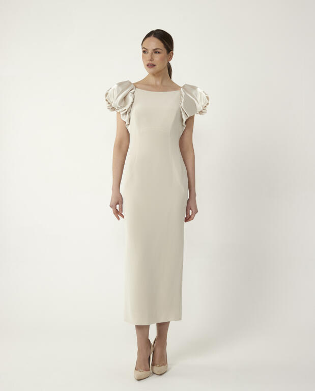 The Sowden Dress is designed to make a statement. Its sleek silhouette flows gracefully to the ankle, while dramatic satin ruched sleeves add sculptural detail and a touch of glamour. Perfect for formal events or evening occasions, this dress combines timeless sophistication with a bold, contemporary edge.